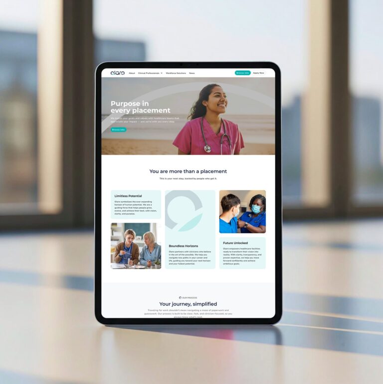 Formerly known as PHHI, Olaro is a travel nursing agency that underwent a complete rebrand and sought a new digital identity to match its evolved vision. Partnering closely with their team, we immersed ourselves in understanding the tone, values, and aesthetic they wanted to convey.